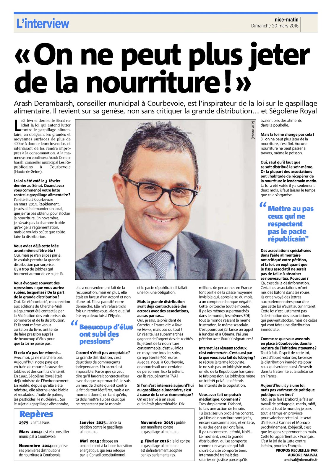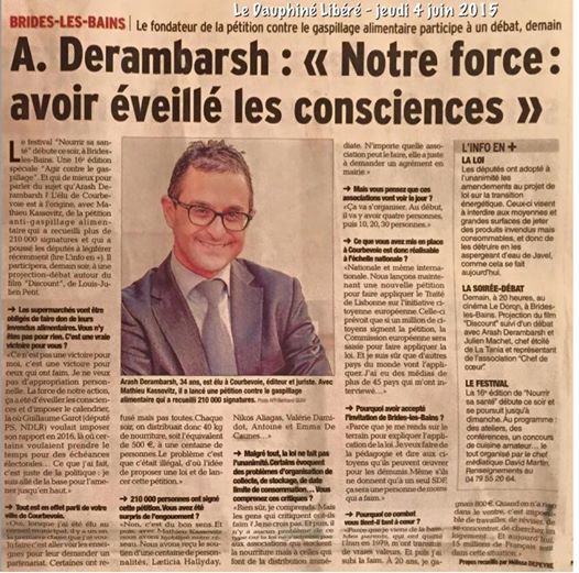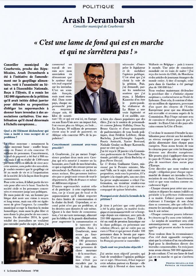 – Arash Derambarsh, auteur du Manifeste contre le gaspillage et élu « Les Républicains » au conseil municipal à Courbevoie, a été interviewé dans Le Huffington Post. Il y défend une loi imposant, ou incitant aux supermarchés de donner, soir après soir, tous leurs invendus consommables à l’association de leur choix.
